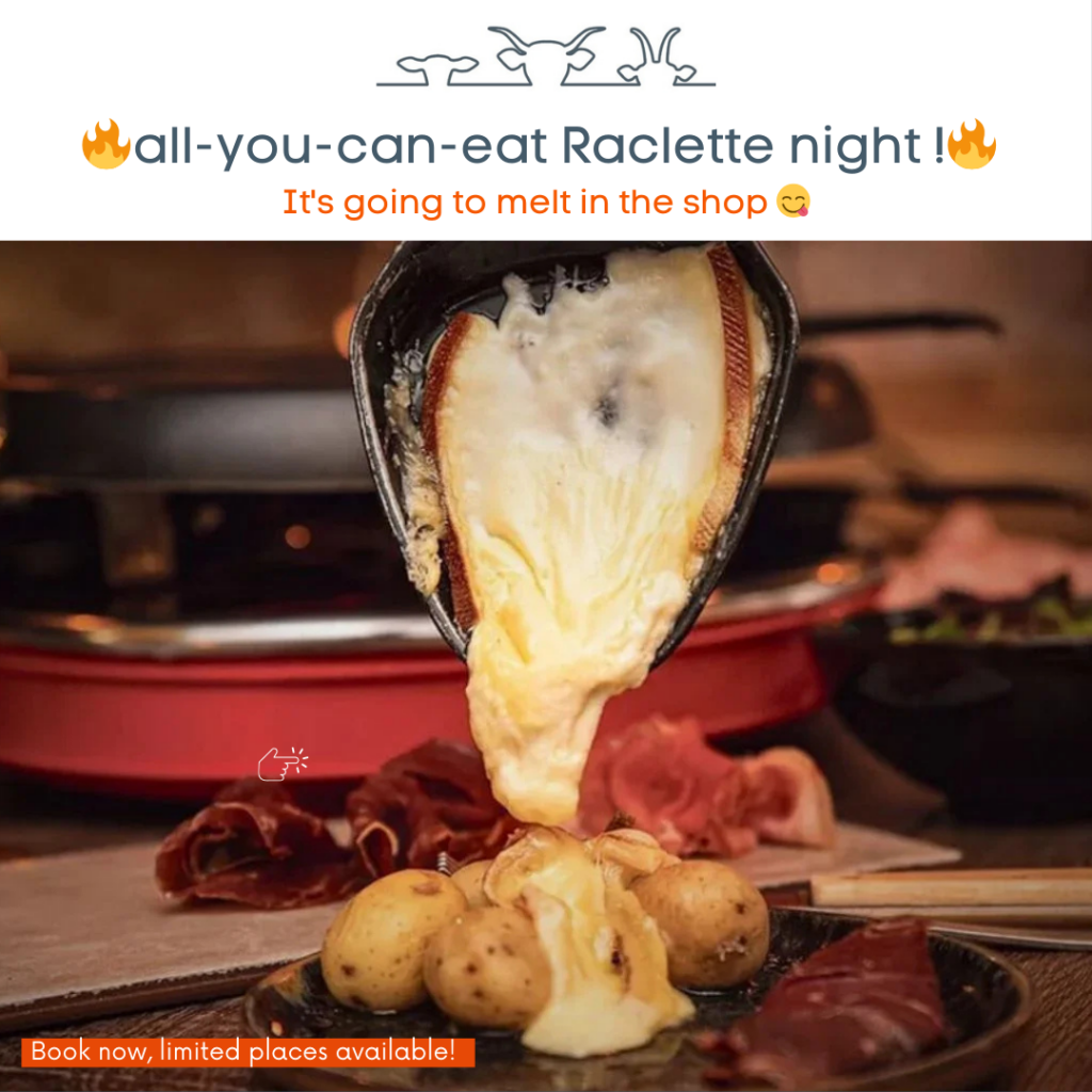 At your favorite cheese shop, every weekend we turn up the heat with our new all-you-can-eat raclette nights!Dive into a festival of flavors with our deliciously melted cheeses and generous, artisanal charcuterie.